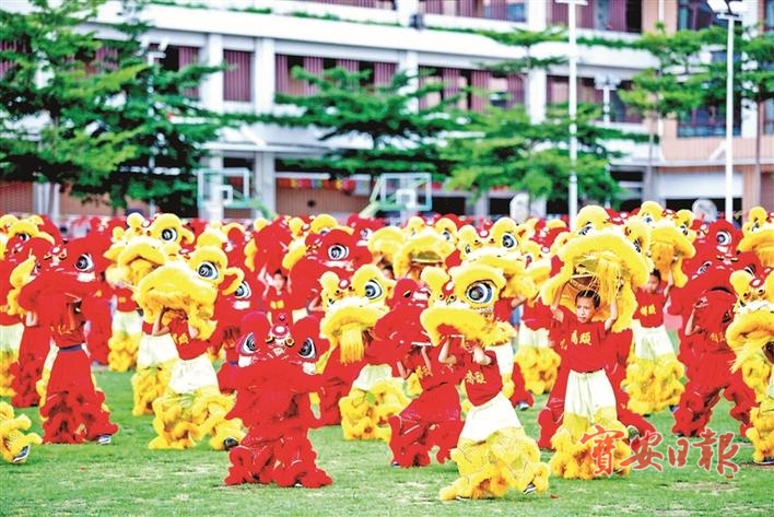 25日上午,伴着激动人心的欢呼,百头醒狮在该校操场上奔跑腾跃,形成一道亮丽的风景线。醒狮团由四头领舞大醒狮和百头小醒狮组成。在激情昂扬的音乐声中,四头大醒狮带领百头醒狮摇头摆尾、奔跑腾跃,场面喜庆,充分展示出中华少年昂扬向上的精神状态。表演最后,四头大醒狮依次展出“百年华诞、国泰民安、繁荣昌盛、伟大复兴”的挂幅标语,为伟大的党和祖国献上美好的祝福。