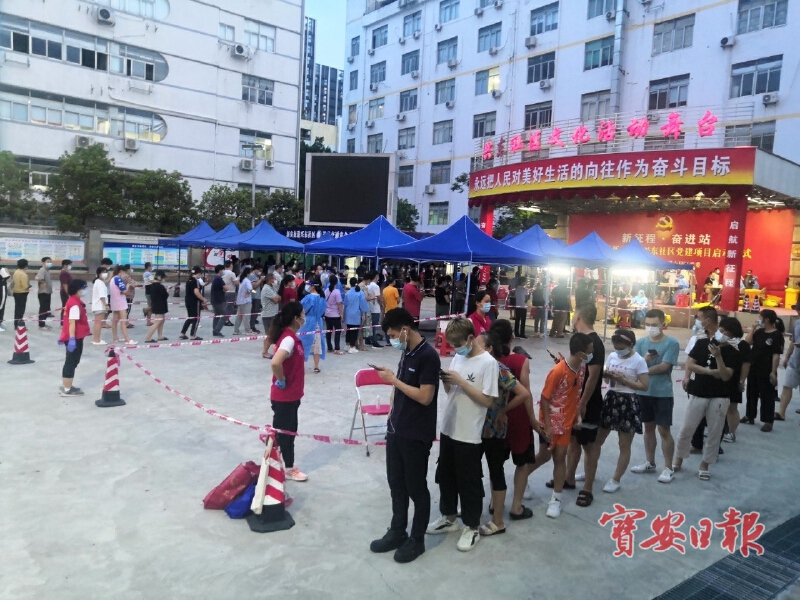新安街道海华社区6月16日晚开启第四轮核酸检测采样工作,辖区共设置10个采样点方便居民就近采样。晚上10点,社区威文大厦核酸检测采样点不少居民在这里自觉排队,支持核酸检测采样工作。