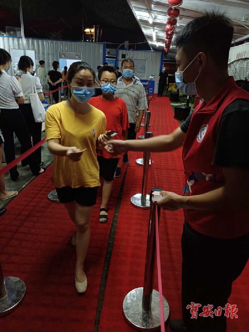 6月26日22时,新安街道海华社区的海华社康核酸采样点,居民检测后领取社区准备的已采样卡片。