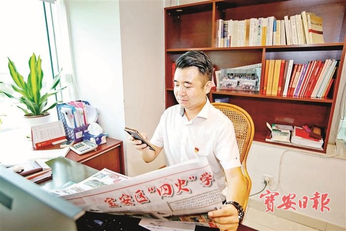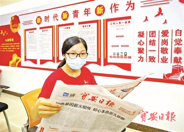 9年党龄的西乡街道共乐社区工作站党支部党员刘丽珊在阅读《宝安日报》8连版特刊。