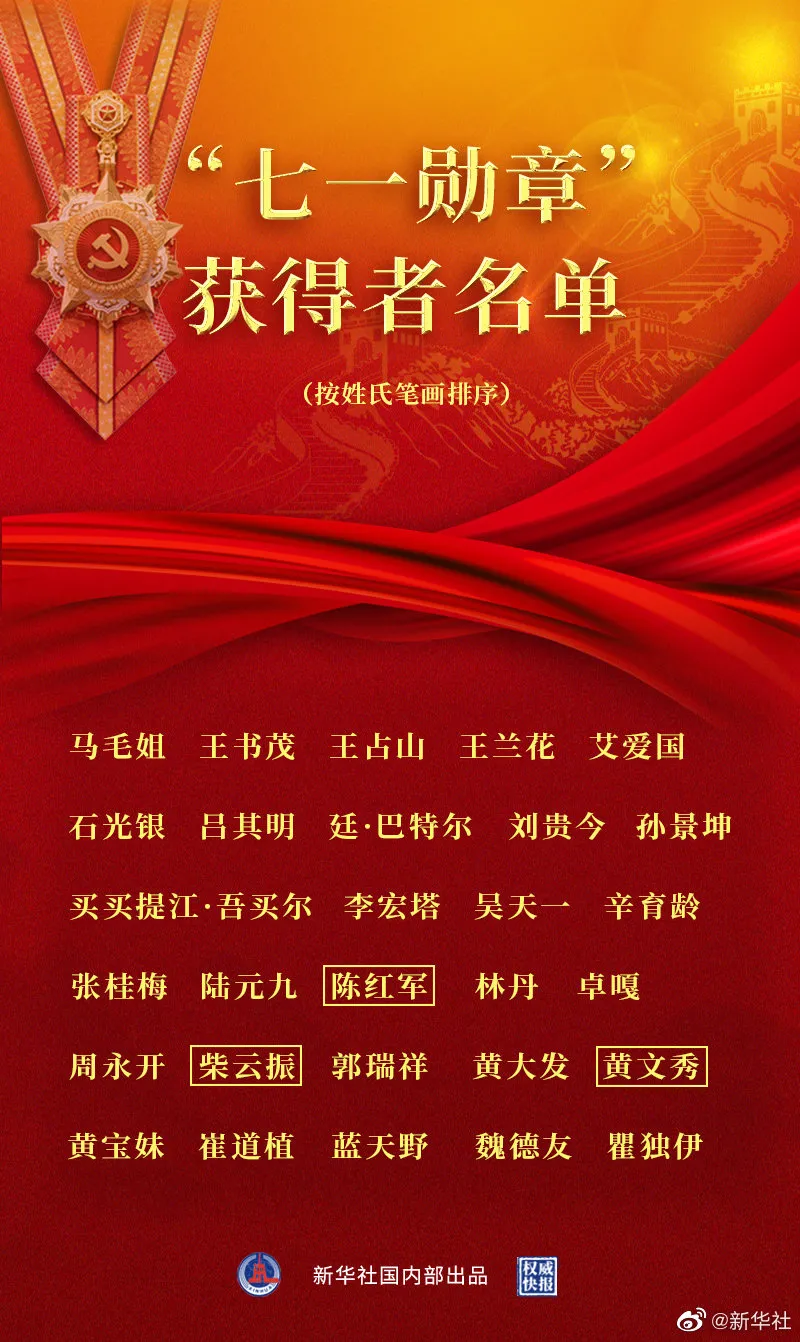 根据《中共中央关于授予“七一勋章”的决定》,授予29名同志“七一勋章”。