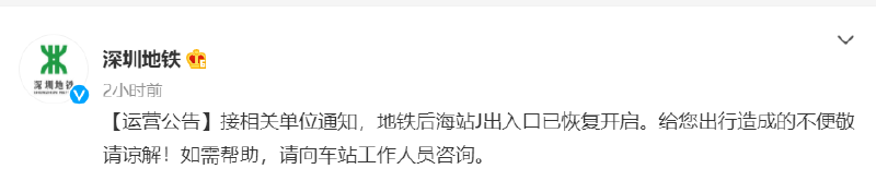据深圳地铁官方微博29日发布公告称,深圳地铁后海站J出口已恢复开启。