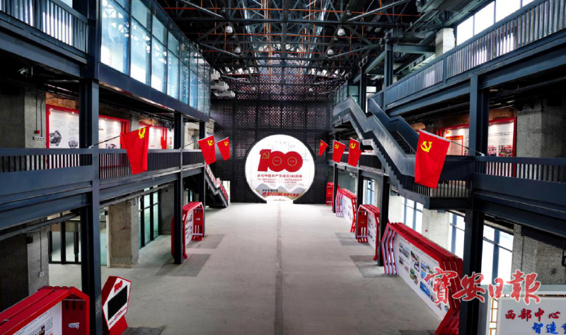 百年党史展示学习区。展示巨型党建主题墙绘,打造红色足迹长廊、中国精神展墙,通过 5G 网络线上展示百年党史重要事件及中国精神,借助 3D 墙雕和 AR 望远镜生动讲述党史故事。