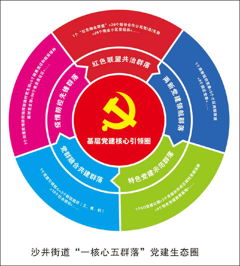 当天,沙井街道党建生态圈同步发布,在区委区政府的坚强领导下,在区委组织部的的悉心指导下,沙井街道党工委坚持“以人民为中心”理念,不断夯实党建基础,巩固党组织主体,拓展党群服务功能,激发党建内生动力,探索建立起基层党建核心、疫情防控先锋、红色联盟共治、两新党建领航、特色党建示范、党群融合共建为主体的“一核心五群落”党建体系,逐步汇聚成良性循环、多元共存、活力蓬勃的“党建生态圈”,助推街道高质量发展。