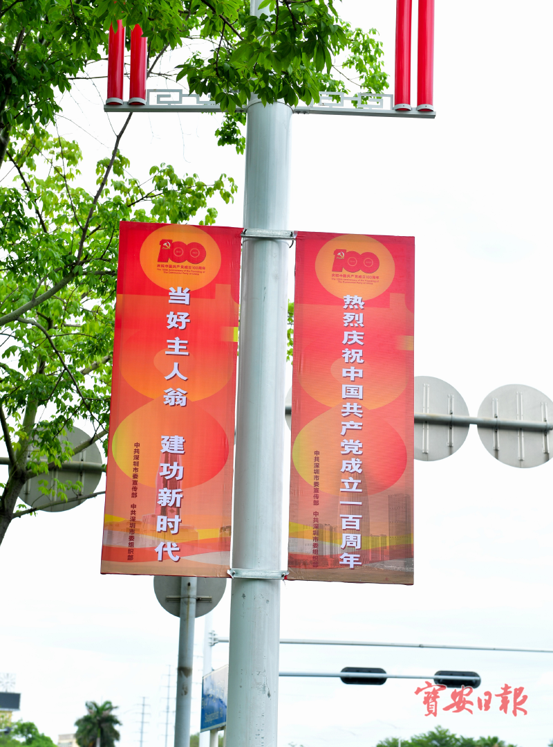 新桥街道分别在辖区中心路、北环路、新沙路、东环路等重要路段布设及更新了灯杆旗挂上标语画面279套;在嘉富新禧和北环路交会处、中心路和瑞丰路交会处、蚝乡路与宝安大道交会处以及广深高速公路出口等主次干道及人口密集地段,利用现有户外广告牌悬挂庆祝建党100周年宣传画面;利用街道办及各社区现有的电子屏幕,刊播庆祝中国共产党成立100周年宣传标语和视频;在市民广场等公园重点位置制作了一批庆祝建党100周年的墙体装饰小品,满城“中国红”庆祝中国共产党成立100周年。