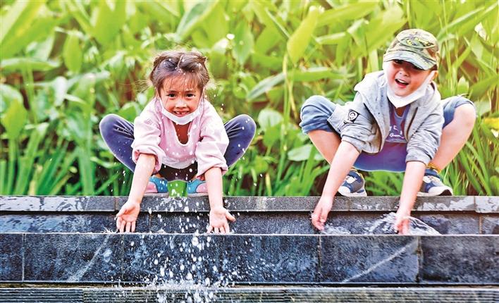 两个小朋友在茅洲河畔戏水。