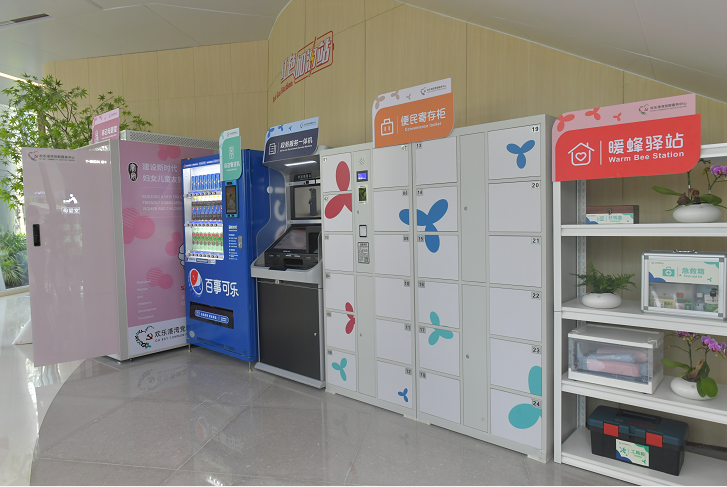 党群服务中心内还设有红色加油站,设立了服务快递员、外卖送餐员、网约车司机等新就业群体的“暖蜂驿站”,提供急救箱、工具箱、充电宝、针线包等。值得一提的是,红色加油站中特别设立了宝安首个移动母婴室,为带娃的家长提供多种便利设施。