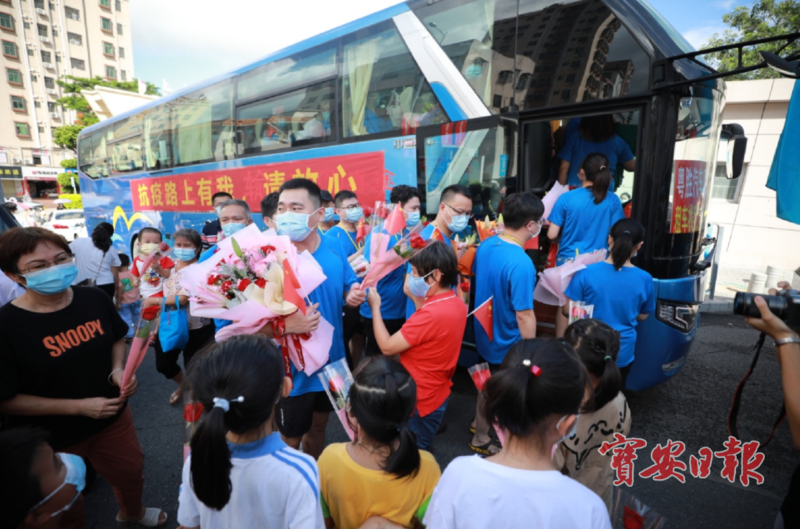 6日上午,宝安福永人民医院下十围专班医护人员凯旋仪式在下十围小学举行,下十围社区居民拿着鲜花送给撤离的医护人员。
