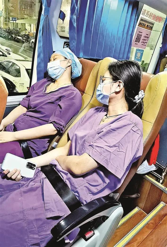 夜深了,辛苦一天的医护人员带着疲惫的身体在大巴车上睡着了。
