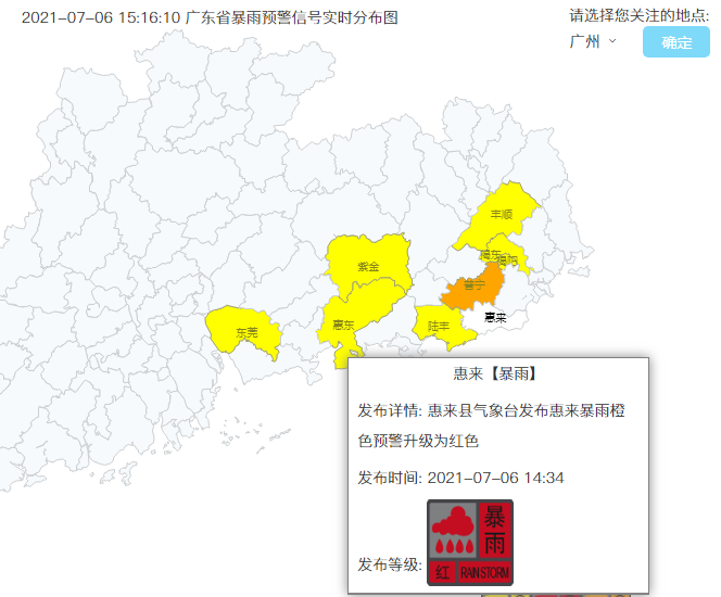 过去6小时,惠来县降水最多,14时29分已升级暴雨红色预警。