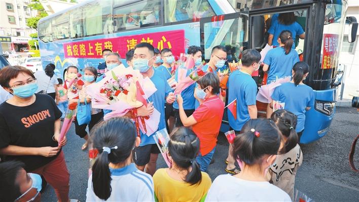 6日上午,宝安福永人民医院下十围专班医护人员凯旋仪式在下十围小学举行,下十围社区居民拿着鲜花送给撤离的医护人员。 深圳特区报记者 刘钢 摄