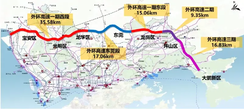 深圳外环高速公路项目起于广深沿江高速公路,路线自西向东经宝安区、光明区、龙华区、东莞市、龙岗区、坪山区、大鹏新区,规划终点接坪西快速路。