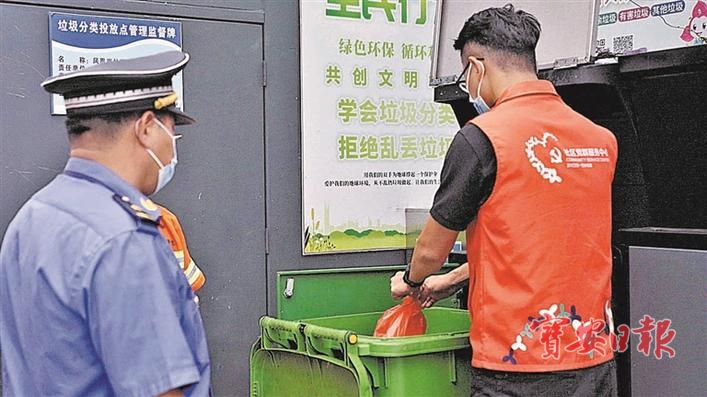 西乡街道凤凰岗社区党委委员黎远锋在垃圾分类点督导。