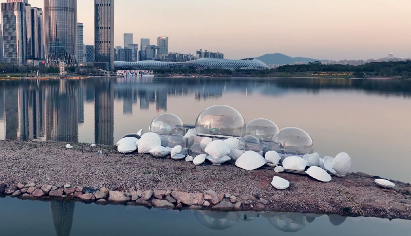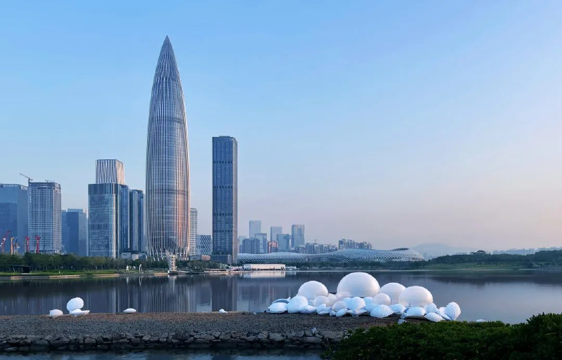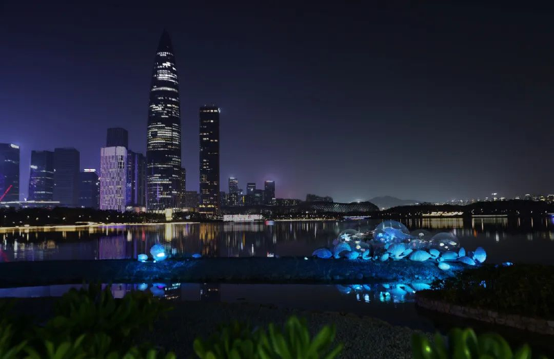 白天,《无界·如鱼得水》如同贝中含珠的雕塑,与城市环境融合,成为深圳人才公园亮丽风景的一部分;夜色初上,水影摇曳,鱼儿在各个鱼缸中来回游动,画面生动、唯美、奇幻……